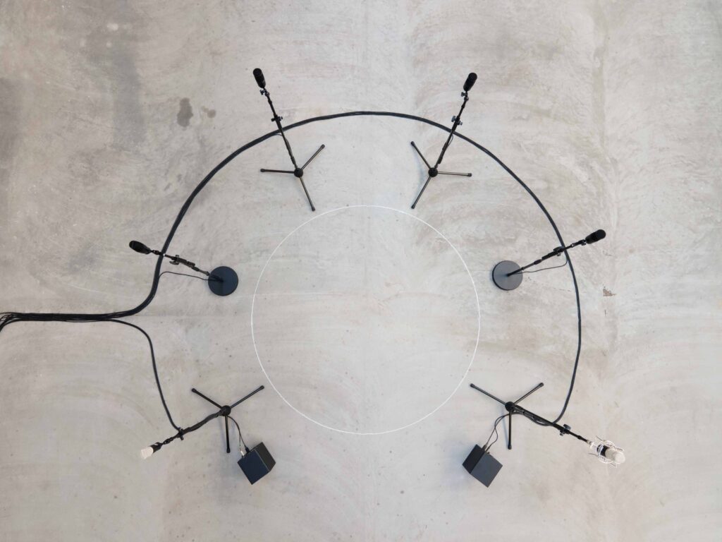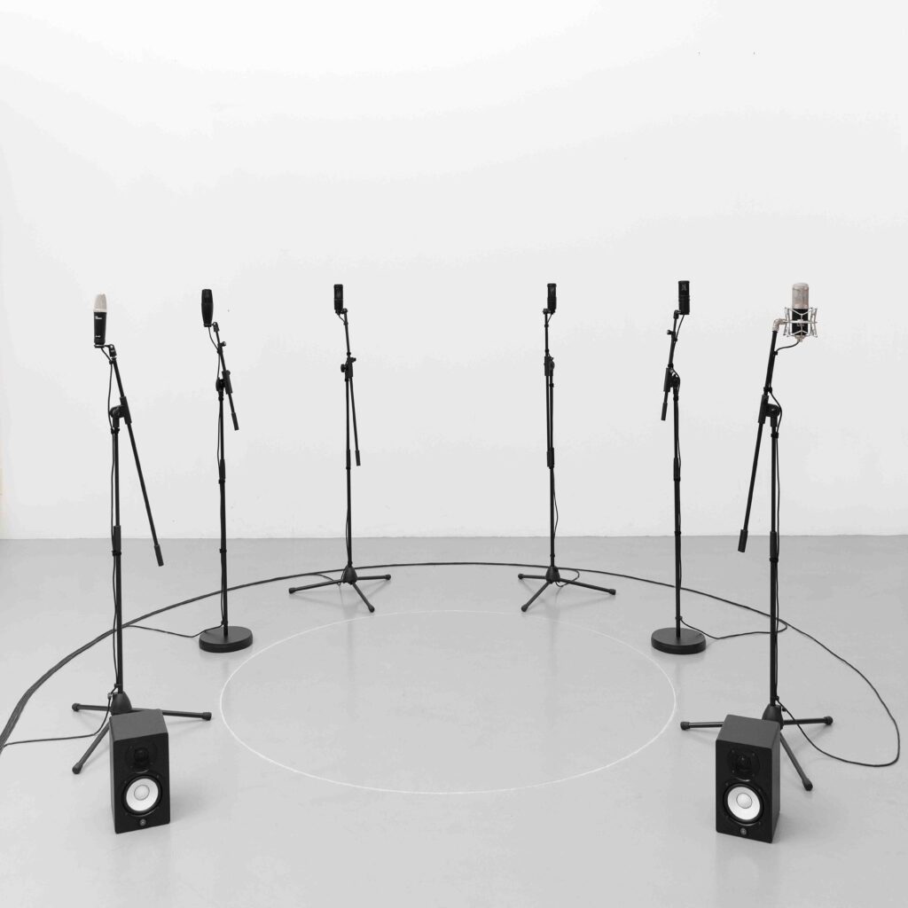 The installation consists of six professional and manipulated microphones, which give voice in a rhythmic way to sounds of cetacean and newborn, (two speakers which produce a suspended sound in a circle drawn with chalk). In deepening the listening of the first, the artist felt a sense of familiarity with the verses produced by the newborn and has therefore imagined to let them communicate as one, creating a choir that brings back to an idea of origin.