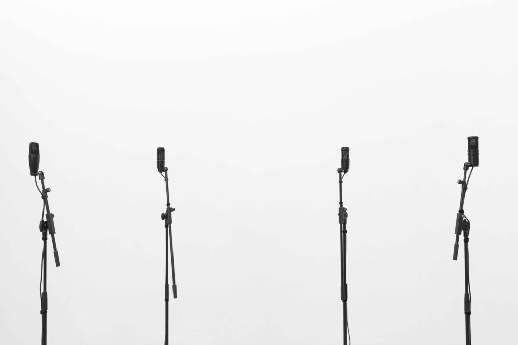 25” sound mix, six manipulated professional studio microphones, three stereo speakers, four players, six mic stands, two active speakers, cabling and sundry installations, chalk drawing, variable size